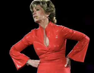 Jane Fonda stood on a warmly lit stage twenty feet from me. Behind her was a massive garish red-purple-pink-yellow-painted image of what was either the