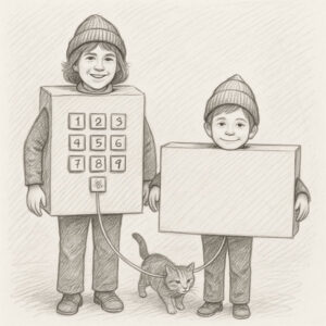 An old lady opens the door, smiling. “Oh, what a clever costume—you’re a phone!