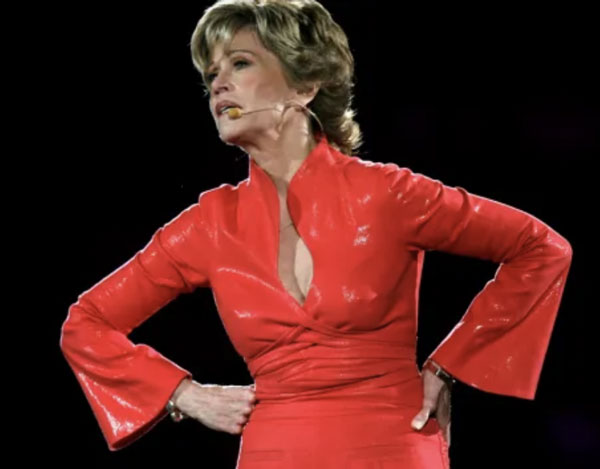 Jane Fonda stood on a warmly lit stage twenty feet from me. Behind her was a massive garish red-purple-pink-yellow-painted image of what was either the inside layers of a flower or a vagina.